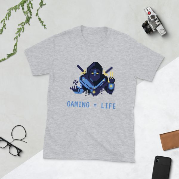 חולצת גיימרים עם כיתוב Gaming = life בסגנון מפוקסל. החולצה עשויה מכותנה איכותית עם תפירה כפולה בקו הצוואר ובשרוולים. החולצה עמידה במיוחד ומתאימה במיוחד ללבוש יום-יומי.